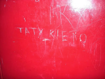 Esa experimentada portera, escrupulosa en exceso, pulcra hasta la obsesión, disciplinada en demasía, locuaz con nadie y huraña con todos, esa portera severa y cicatera, se dedica en las horas de menor tráfico vecinal a grabar frases obscenas en el interior del ascensor, ayudada por un objeto demasiado parecido a una navaja.PD.-(¿Os habéis fijado en el "TATY KIETO"?¡Yo me mondo!)